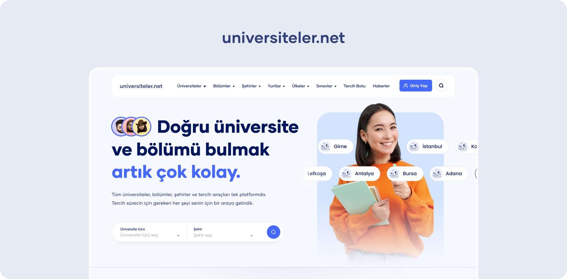 Üniversiteler.net'e özgün marka kimliği ve dijital platform kazandırdık.Tasarım dilinden web arayüzüne kadar her detayı özenle tasarlayarak, markanın sektörde fark yaratmasını sağladık.